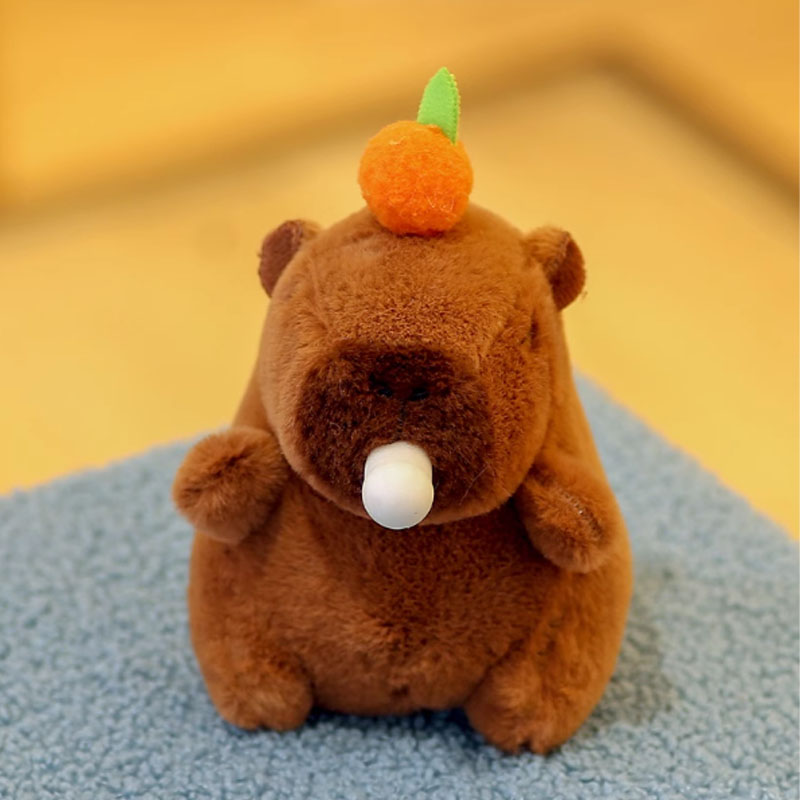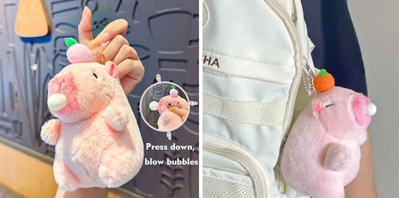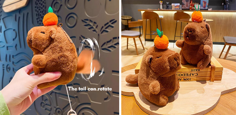 С капибарой в качестве основного дизайна изображение показывает плюшевую форму капибары. Этот плюшевый материал может лучше представлять внешний вид капибары, а общий образ чрезвычайно восхитительна. CapyBara поставляется в двух разных цветах, а именно розовом и коричневом. На их головах разные фрукты, такие как хурмы, персики и яблоки, и их глаза бежат. Этот плюшевый матч Capybara также имеет интерактивную функцию. Пока вы тянете веревку, его хвост может вращаться. Когда вы зажимаете его лицо, он может дуть пузыри, а при продувке пузырьков он может даже издавать звуки. Его уникальные навыки могут более эффективно привлекать клиентов и завоевать их пользу.