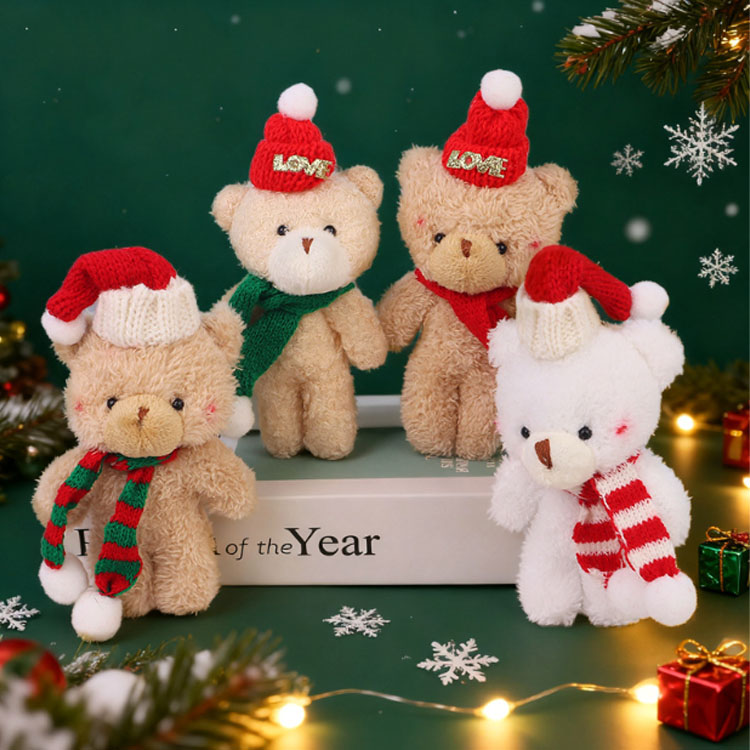 Эта фаршированная игрушка для рождественского фарширования в форме плюшевого мишка, у нее есть два разных материала, а именно плюшевый и плюшевый флис. Мех плюшевого флиса слегка кудряс. Оба материала имеют гладкую и мягкую текстуру и очень легкие. Плюшевый флисовый медведь поставляется в двух цветах: светло -коричневый и темно -коричневый. Плюшевый медведь также имеет два цвета: коричневый и белый. Каждый медведь в паре с различным шарфом, и каждый медведь носит красную рождественскую шляпу, добавляя праздничное прикосновение. Шарфы и шляпы медведей вязаны и украшены белыми помпонами, которые выглядят очень деликатными. Глаза медведя черные, а его щеки усеяны румянцем, что делает его очень милым. Его внешний вид завоевал любовь многих клиентов.
